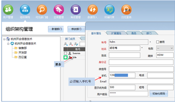人員維護的時候,需要給賬號設(shè)置其手機號碼,該手機號碼與企業(yè)微信里面設(shè)置的手機號碼要求一樣。這個設(shè)置是為了解決Gungho系統(tǒng)與企業(yè)微信的單點需求