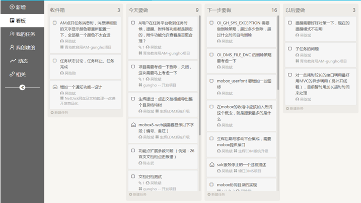任務(wù)管理是企業(yè)協(xié)同的重要組成部分。 任務(wù)管理是企業(yè)內(nèi)部事務(wù)協(xié)同的重要工具,與傳統(tǒng)的OA有類似之處,都是推動企業(yè)內(nèi)部事務(wù)有效快速的推進,但之前存在不同之處,OA是屬于剛性流程化的管理,側(cè)重于流程與規(guī)范,任務(wù)管理側(cè)重于人員、事務(wù)之間的協(xié)同,側(cè)重于靈活度與協(xié)同性上 從靈活度上看,可以用于企業(yè)各種事務(wù)的管理與處理,比如客戶進展管理、開發(fā)進度、產(chǎn)品設(shè)計等