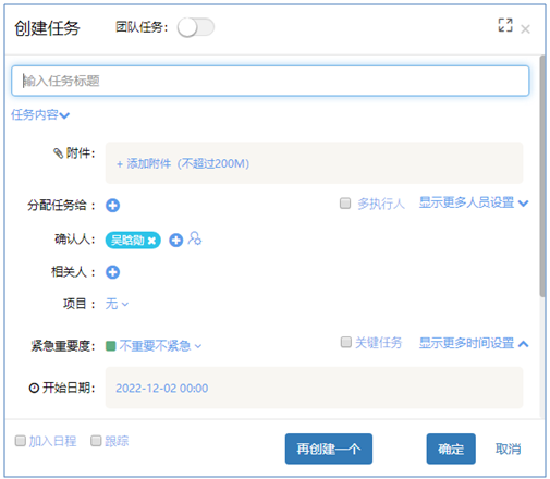 當(dāng)團(tuán)隊(duì)任務(wù)的開關(guān)打開后,我們?cè)诜峙淙蝿?wù)的時(shí)候就可以選多人,點(diǎn)確定后就可以創(chuàng)建一個(gè)團(tuán)隊(duì)任務(wù)。