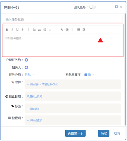 創(chuàng)建任務(wù)時(shí)必須要輸入的屬性是“任務(wù)標(biāo)題”,如果任務(wù)標(biāo)題無法把任務(wù)描述清楚,可以點(diǎn)上圖“創(chuàng)建任務(wù)”彈框中的“添加任務(wù)描述”,點(diǎn)擊后彈框中會(huì)出現(xiàn)任務(wù)描述輸入?yún)^(qū),如下圖紅色框線區(qū)顯示: