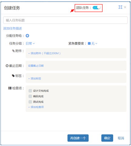 創(chuàng)建團(tuán)隊(duì)任務(wù)的入口和方法同上面的任務(wù)創(chuàng)建,不同的是創(chuàng)建團(tuán)隊(duì)任務(wù)需要把團(tuán)隊(duì)任務(wù)的開關(guān)打上,如下圖紅色框線區(qū)域顯示。