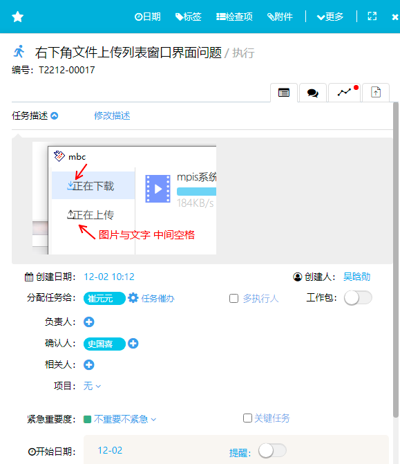新到達任務點擊確認后任務進入執(zhí)行階段,在執(zhí)行過程中任務的關聯人(創(chuàng)建者,執(zhí)行人,相關人)之間可以圍繞這個任務展開交流。可以在我的任務,我創(chuàng)建的任務,任務看板,相關任務中點擊任務項后查看任務,并對任務進行交流,任務的顯示頁面如下圖所示。