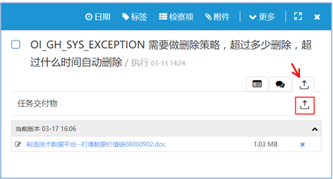 點上圖中的紅色框線區(qū)域的“上傳”按鈕即可選擇文件進行上傳,上傳成功后會在任務交付物 列表中顯示。 如果要刪除交付文件,點擊交付文件后面的“刪除”按鈕。