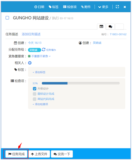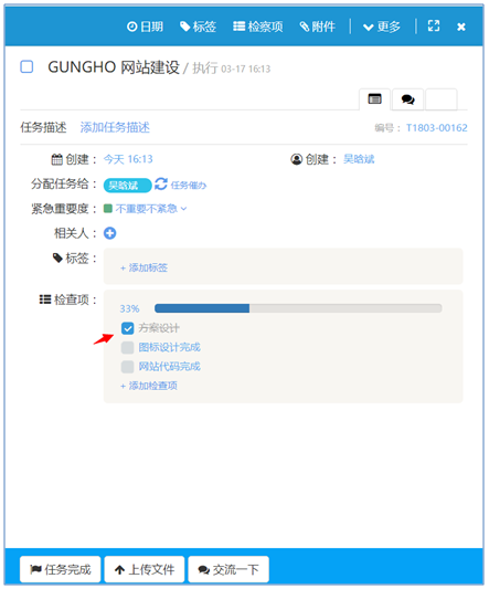 如果任務在創(chuàng)建時有設置過檢查點,任務執(zhí)行人可以在任務顯示頁面中通過任務檢查點來設置任務進度,如下圖紅色箭頭指處所示: