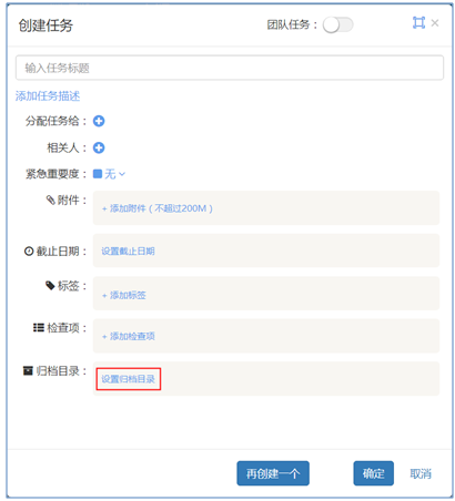 在項目中創(chuàng)建任務,系統(tǒng)彈出的創(chuàng)建任務彈框會比平常任務創(chuàng)建彈框多一個歸檔目錄設置,如下圖紅色框線區(qū)域所示。