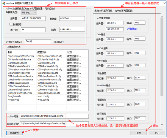 這個(gè)里面的數(shù)據(jù)來自對本機(jī)已經(jīng)部署服務(wù)的信息獲取。一般這些是不需要修改的(除了人員服務(wù)的外部地址)。但若存在某些服務(wù)不在本機(jī)的情況,可以對該服務(wù)的IP及端口進(jìn)行調(diào)整。調(diào)整會更新該服務(wù)涉及的所有相關(guān)配置