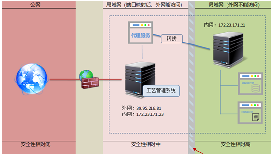 產(chǎn)品生產(chǎn)加工工藝展示系統(tǒng)的APP獨(dú)立一臺服務(wù)器,這個服務(wù)器能被外網(wǎng)訪問。系統(tǒng)訪問的數(shù)據(jù)庫及工藝文件在另外一臺服務(wù)器,而這個服務(wù)器是不提供外網(wǎng)訪問的。
