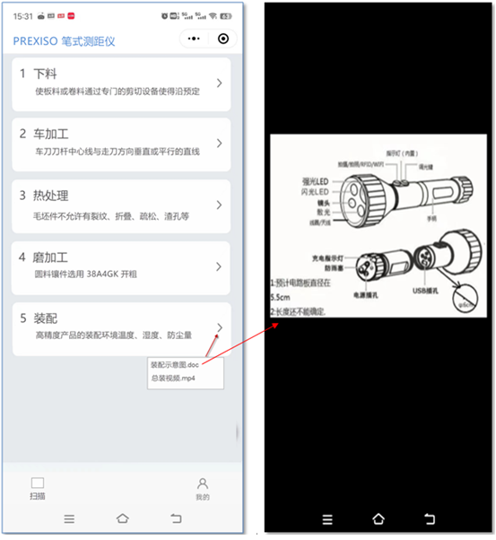 掃描二維碼,后顯示下圖,能查看當(dāng)前產(chǎn)品的工藝步驟,點(diǎn)擊某工藝步驟后 ,查看針對的工藝文件