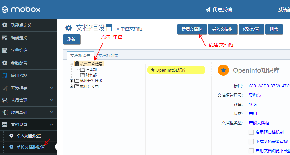 2)在mobox的 “文檔設(shè)置-單位文檔柜設(shè)置” 里面建立 文檔柜
