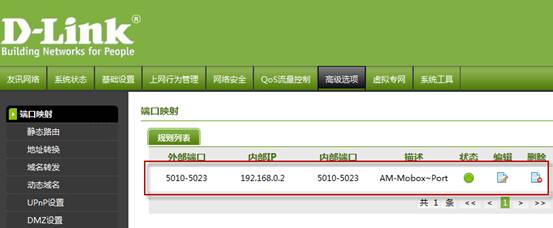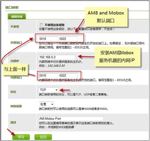 將Mobox企業(yè)云盤相關(guān)服務(wù)所用到的端口(默認是 5010~5022)進行端口映射設(shè)置,若自己與改過Mobox服務(wù)端的端口,則按實際的端口配置 (AM即時通的端口也是一樣的)
