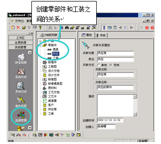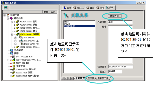? ? ? 當(dāng)設(shè)計(jì)人員完成了一個零部件的設(shè)計(jì)后,其它管理人員可以在”共好”上完善該零部件和工裝等管理信息之間的關(guān)聯(lián)關(guān)系,見下圖: