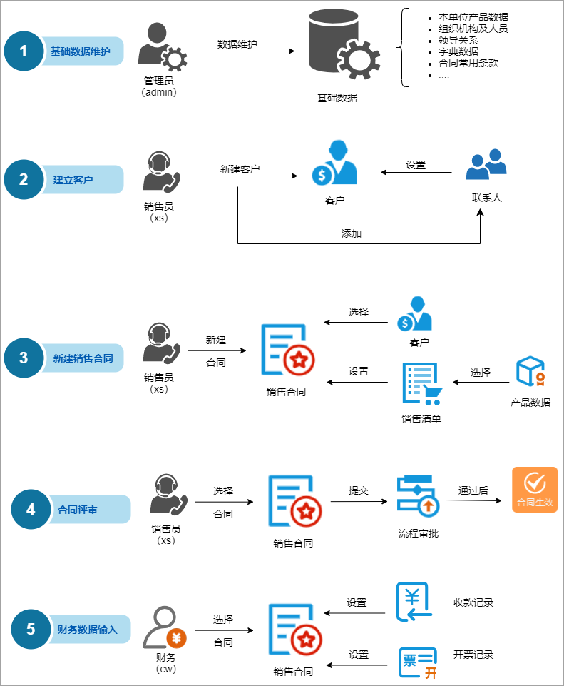 合同軟件涉及的企業(yè)員工角色:銷售、采購、管理員、主管、財(cái)務(wù)。以下是各個角色主要需要做的事情。