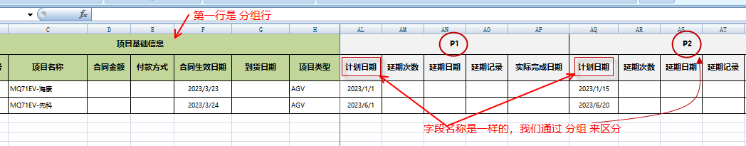 在P1 下面有 計(jì)劃日期;在P2下面也有 計(jì)劃日期 ,2個字段名稱是一樣的。我們做讀取數(shù)據(jù)的時候必須要依賴分組 P1、P2的定義才能區(qū)分