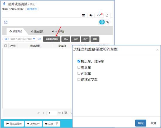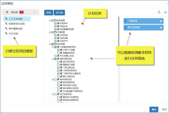 針對上圖:我們選擇了人工叉車試驗(yàn)這個(gè)模板,若全選,那么就是對叉車整車做檢測了。但又的時(shí)候甲方并不是整車而是某幾個(gè)部件,所以,系統(tǒng)也支持通過特征選項(xiàng)的方式來對計(jì)劃任務(wù)進(jìn)行篩選。 篩選完成后確定,就能生成新的測試項(xiàng)目。