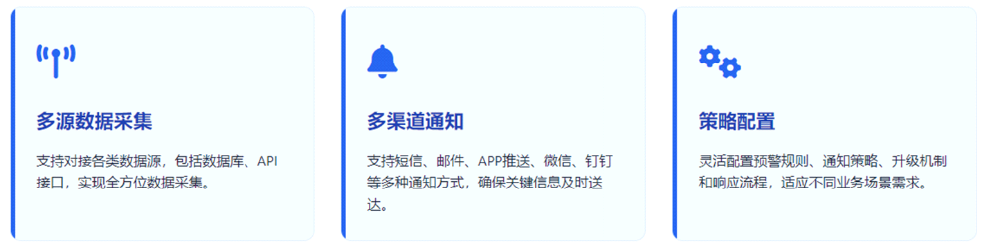 mobox預(yù)警管理平臺(tái)系統(tǒng)集采集、預(yù)警提醒一體,通過按需數(shù)據(jù)采集(可以企業(yè)自己IT人員來維護(hù))、多渠道通知機(jī)制,幫助組織及時(shí)發(fā)現(xiàn)潛在風(fēng)險(xiǎn),快速響應(yīng)各類事件,有效降低運(yùn)營風(fēng)險(xiǎn),提升管理效率 。系統(tǒng)采用模塊化設(shè)計(jì),支持高度定制化,可廣泛應(yīng)用于金融風(fēng)控、生產(chǎn)安全、IT運(yùn)維、環(huán)境監(jiān)測、公共衛(wèi)生等多個(gè)領(lǐng)域,滿足不同行業(yè)的預(yù)警管理需求。