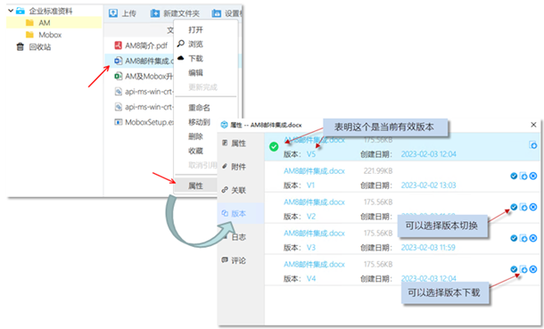 版本管理是一個(gè)非常重要的功能,在文檔中心及部門共享內(nèi),文檔柜里面同名文件多次上傳后會(huì)產(chǎn)生版本,可以設(shè)置哪個(gè)版本為有效版本 ,可以按需下載歷史版本